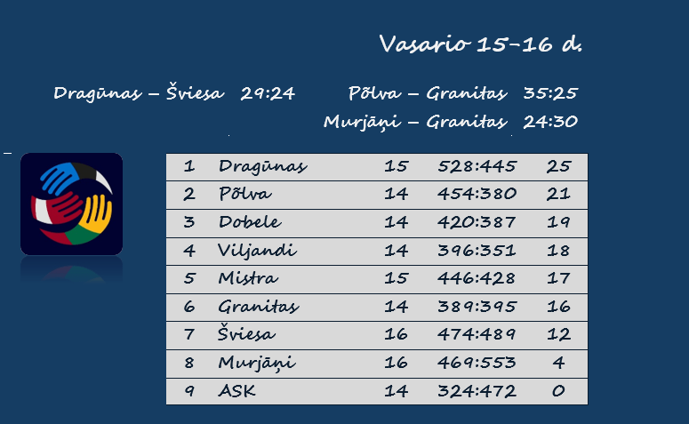Savaitgalį vyko dar trejos Baltijos lygos rungtynės. Dvi pergales iškovojo „Viljandi“ rankininkai. Jie išvykoje nugalėjo „Murjāņi“ 42:32 ir namie – „Serviti“ 27:26. Latvijos komandų dvikovoje Baltijos lygos čempionas Duobelės „Tenax“ įveikė Rygos ASK ekipą 29:21.