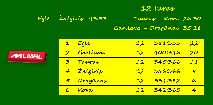 „Tauras“ atsitraukė po to, kai šeštadienį namie nusileido paskutinę vietą užimančiai Panevėžio „Kovai“ 26:30 (12:15). Tuo tarpu dvi pirmaujančios komandos įtikinamai laimėjo žaisdamos namie: Vilniaus „Eglė“ nugalėjo Kauno „Žalgirį“ 43:33 (23:11), „Garliava“ – Klaipėdos „Dragūną“ 35:28 (18:15). „Eglė“ tapo pirmąja komanda, šį sezoną įmetusia 40 ar daugiau įvarčių.
