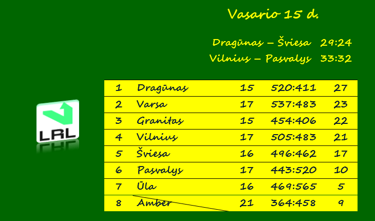Nacionalinėse varžybose nuo spalio pradžios nepralaimintis „Dragūnas“ namie nugalėjo čempionės vardą ginančią Vilniaus „Šviesą“ 29:24 (15:9), „Vilnius“ irgi savo aikštėje įveikė Pasvalio „Pieno Žvaigždes“ 33:32 (15:15).