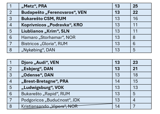 Iki grupių varžybų pabaigos likus vienam turui, jau aišku, kad į ketvirtfinalį iškart pateks „Metz“, Budapešto „Ferencvaros“, Djoro „Audi“ ir „Esbjerg“ komandos. Teisę žaisti aštuntfinalyje užsitikrino Bukarešto CSM, Koprivnicos „Podravka“, Liublianos „Krim“, „Odense“, „Brest-Bretagne“ ir „Ludwigsburg“.