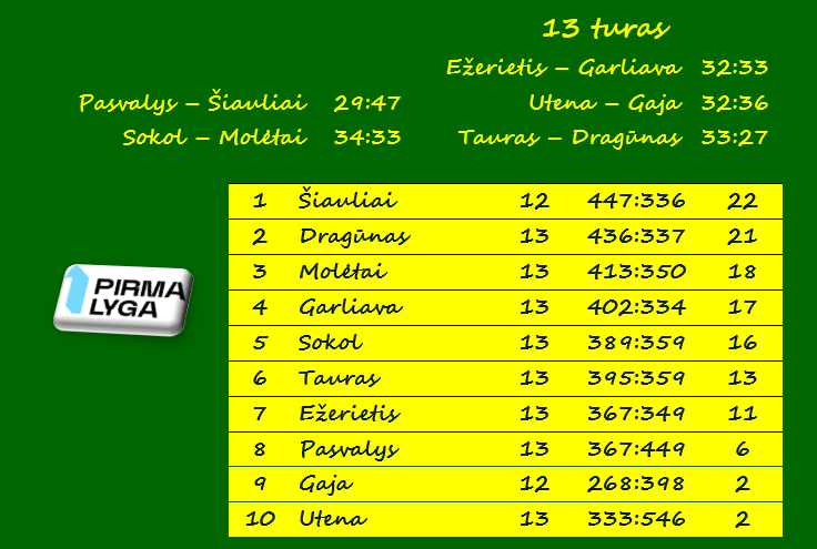 Trečiadienį įvyko paskutinės Lietuvos vyrų rankinio pirmosios lygos 13-ojo turo rungtynės. Po jų į lentelės viršūnę grįžo „Šiaulių“ rankininkai, išvykoje nesunkiai nugalėję Pasvalio „Pieno Žvaigždžių“ dublerius 47:29 (22:11).