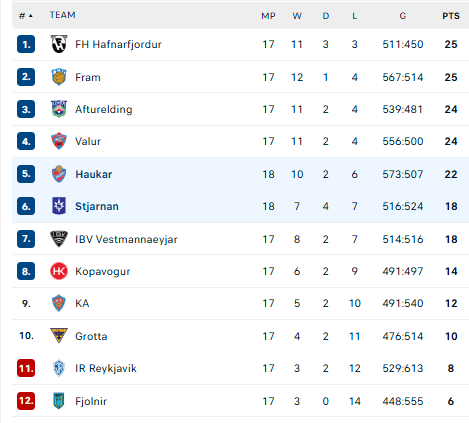 Pirmauja: FH, „Fram“ – po 25, „Afturelding“, „Valur“ – po 24, „Haukar“ – 22, „Stjarnan“ – 18.