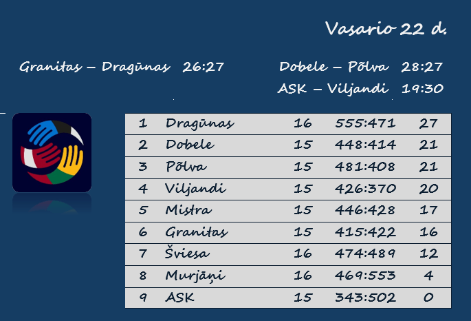„Granitas“ per 15 rungtynių surinko 16 taškų ir yra šeštas. Kauniečiai užsitikrino kelialapį į ketvirtfinalį, o paskutines reguliariojo sezono rungtynes žais kitą šeštadienį (kovo 1 d.) Estijoje su Rasiku „Mistra“. „Mistra“ turi 17 taškų ir užima penktąją vietą, tad pergalės atveju „Granitas“ aplenktų Rasiku rankininkus.