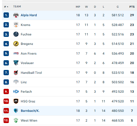 Pirmauja: „Alpla“ – 29, „Krems“, „Füchse“ – po 23, „Bregenz“ – 21, „Fivers“, „Vöslau“ – po 20.