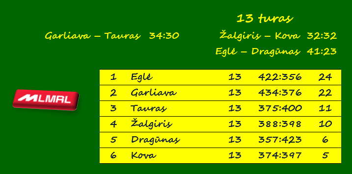 Pirmosios 13-ojo turo rungtynės vyko anksčiau. Jose čempionės vardą ginanti „Garliava“ namie nugalėjo Vilniaus „Taurą“ 34:30 (17:18).