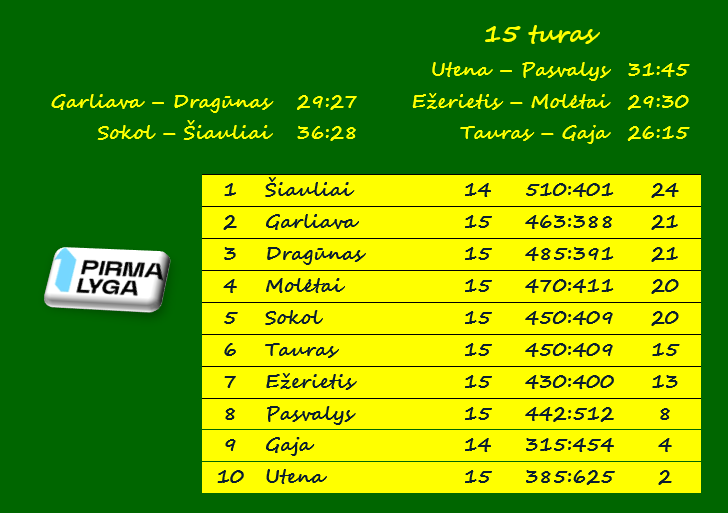 Po 15-ojo turo lentelės pirmojoje eilutėje lieka „Šiauliai“. Jie iškovojo 24 taškus ir dar žais vienerias nukeltas rungtynes. Po 21 tašką turi „Garliava“ ir „Dragūno“ dubleriai, po 20 taškų – „Molėtai“ ir „Sokol“.