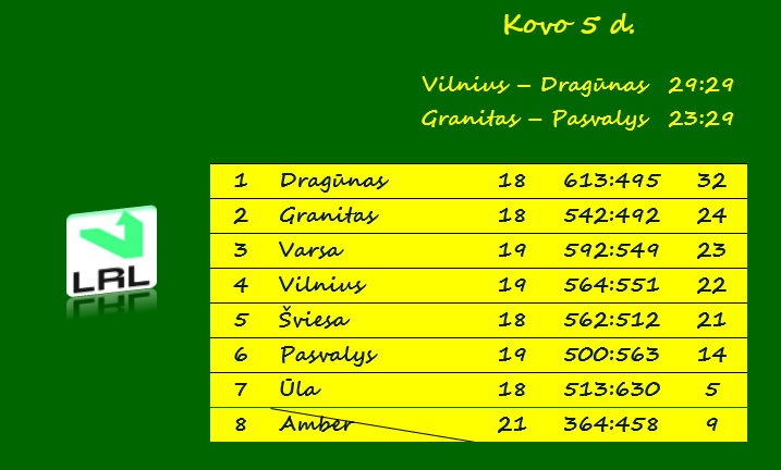 Tuo tarpu kova dėl antrosios vietos tęsiasi. „Granitas“ turi 24 taškus, Alytaus „Varsa“ – 23, „Vilnius“ – 22, Vilniaus „Šviesa“ – 21. Tačiau „Granitui“ ir „Šviesai“ reguliariajame sezone liko po trejas rungtynes, „Varsai“ ir „Vilniui“ – tik po dvejas.