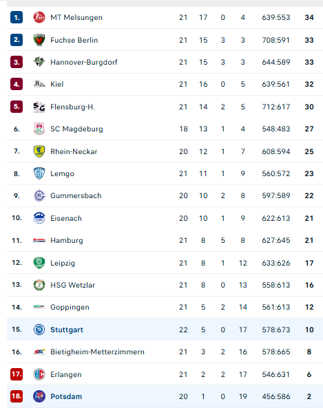 Pirmauja: „Melsungen“ – 34, „Füchse“, „Hannover“ – po 33, „Kiel“ – 32, „Flensburg“ – 30, „Magdeburg“ – 27, … „Stuttgart“ – 10.