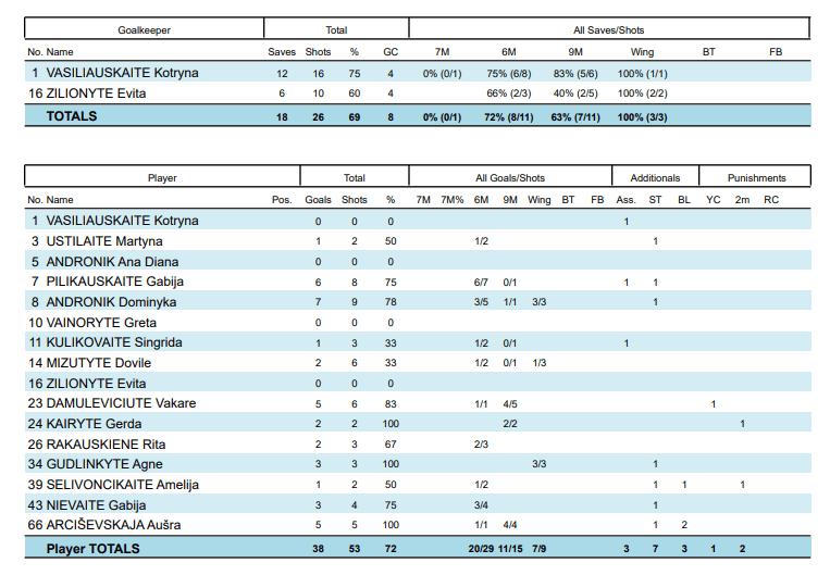 Lietuvos rinktinėje įvarčius įmetė net dvylika rankininkių, o rezultatyviausiai žaidė 7 įvarčius pelniusi Dominyka Andronik.