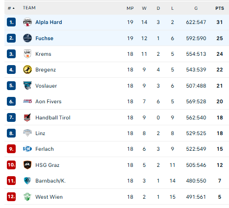 Pirmauja: „Alpla“ – 31, „Füchse“ – 25, „Krems“ – 24, „Bregenz“ – 22, „Vöslau“ – 21.