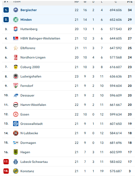 Pirmauja: „Bergische“ – 34, „Minden“ – 29, „Hüttenberg“, „Balingen“ – po 27, „Elbflorenz“ – 25.