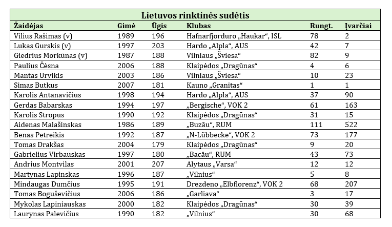 Užtat keli žaidėjai į rinktinę atvyko puikios nuotaikos. Hardo „Alpla“, kurioje žaidžia Karolis Antanavičius ir vartininkas Lukas Gurskis, pirmauja Austrijos lygoje, „Bergische“, kuriai atstovauja Gerdas Babarskas, yra pirma Vokietijos antrojoje lygoje. Maža to, šiedu klubai praėjusį savaitgalį įspūdingai laimėjo lyderių dvikovas.