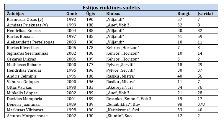 Estijos rinktinei šią savaitę nepavyko suburti stipriausios sudėties. Labiausiai trūks per praėjusį atrankos langą daugiausiai įvarčių (18) įmetusio 27 metų Karlo Toomo. „Sulaibkhait“ (Kuveitas) klube žaidžiantis kairysis pusiau kraštinis gydosi nugaros traumą. „Jam nežaidžiant, neteksime bent 5-7 įvarčių, – skaičiavo rinktinės trenerio padėjėjas Janaras Magi. – Tikimės, kad didesnis bus Davido Mamporijos indėlis, pasitelksime „Viljandi“ klube kartu žaidžiančių Aleksanderio Pertelsono, Hendriko Kokso ir Karlo Roosnos jungtį.“