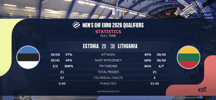 Lietuvos rinktinė po trejų rungtynių turi 4 taškus. Estijos rankininkai taškų neiškovojo. Lietuviai ir estai šią savaitę susitiks dar kartą. Antrąsias tarpusavio rungtynes komandos žais sekmadienį Klaipėdoje.