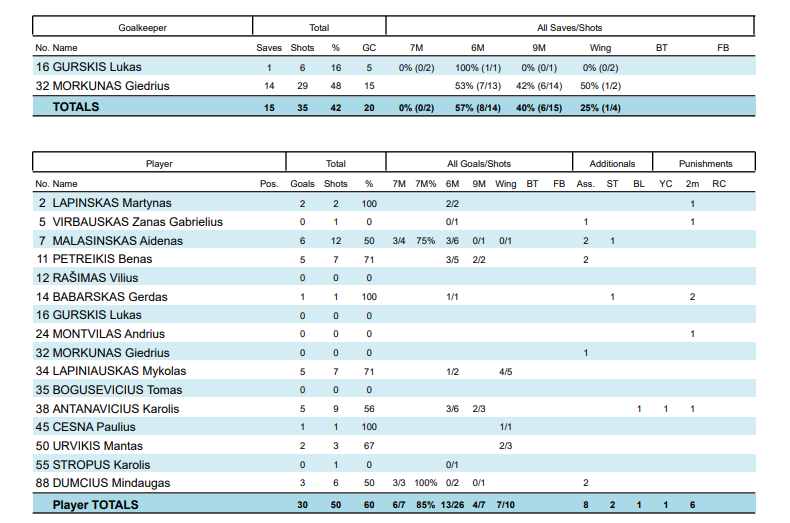 Lietuva: Malašinskas 6, Petreikis 5, Lapiniauskas 5, Antanavičius 5, Dumčius 3, Lapinskas 2, Urvikis 2, Babarskas 1, Čėsna 1.