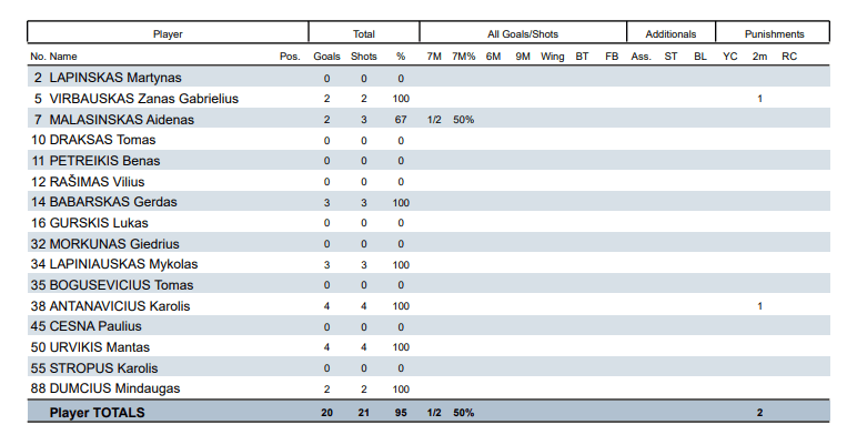 Lietuva: Antanavičius 8, Urvikis 6, G.Virbauskas 4, Babarskas 3, Lapiniauskas 3, Dumčius 3, Malašinskas 2, P.Čėsna 2, Stropus 2, Drakšas 1, Lapinskas 1.