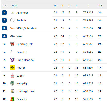 Galutinės reguliariojo sezono lentelės lyderiai: „Aalsmeer“ – 36, „Achilles“ – 36, „Kras“ – 32, „Vise“ – 28, „Sporting“ – 26, „Bevo“ – 25.