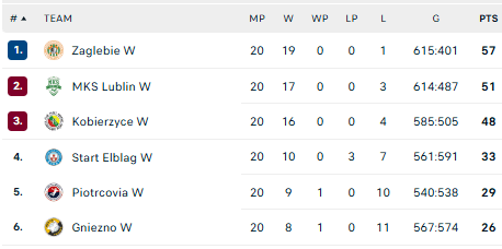 Pirmauja: „Zaglębie“ – 57, „Lublin“ – 51, „Kobierzyce“ – 48, „Start“ – 33, „Piotrcovia“ – 29.