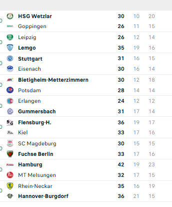 Pirmauja: „Bergische“ – 36, „Minden“ – 30, „Balingen“, „Hüttenberg“ – po 29, „Elbflorenz“ – 26, „Nordhorn“, „Coburg“ – po 25, … „N-Lübbecke“, „Grosswallstadt“ – po 21.
