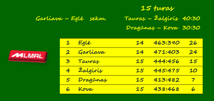 Per 15 rungtynių 15 taškų iškovojęs „Tauras“ užėmė trečiąją vietą. Ketvirtas liko „Žalgiris“ (10 tšk.), penktas – „Dragūnas“ (6), šešta – „Kova“ (5).