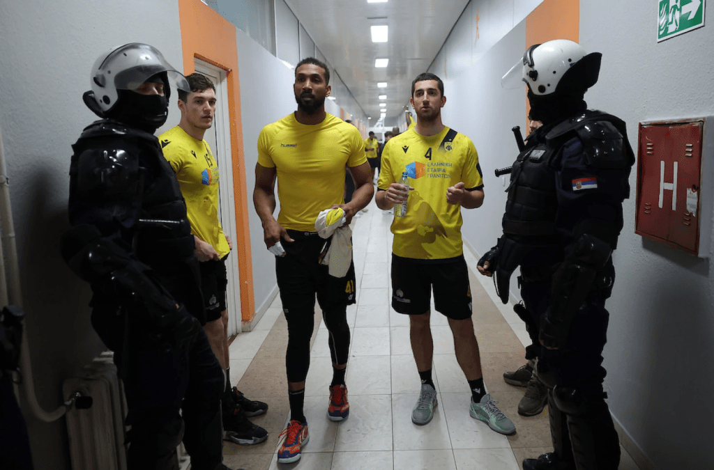 AEK rankininkams vos įžengus į salę, „Partizan“ sirgaliai pradėjo į juos mėtyti įvairius daiktus. Į aikštę iš tribūnų atskriejo ir kelios petardos. Išsigandę AEK žaidėjai grįžo į rūbinę, o sąmyšiui tribūnose tęsiantis, Europos rankinio federacija (EHF) atšaukė rungtynes.