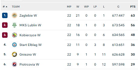 Pirmauja: „Zaglębie“ – 63, „Lublin“ – 56, „Kobierzyce“ – 48, „Start“ – 36, „Gniezno“ – 30, „Piotrcovia“ – 29.