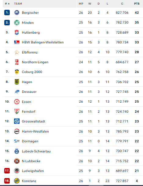 Pirmauja: „Bergische“ – 42, „Minden“ – 35, „Hüttenberg“, „Balingen“ – po 33, „Elbflorenz“ – 28, … „N-Lübbecke“ – 22.