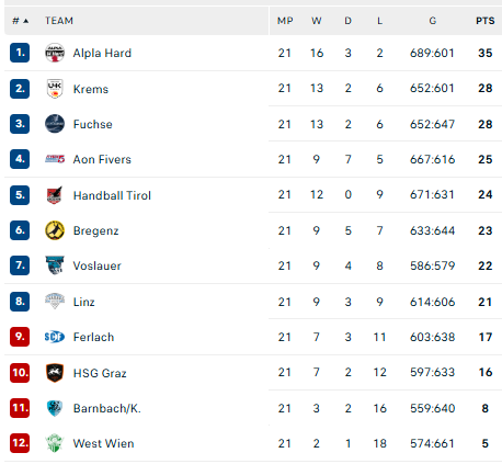 Pirmauja: „Alpla“ – 35, „Krems“, „Füchse“ – po 28, „Fivers“ – 25, „Tirol“ – 24, „Bregenz“ – 23, „Vöslau“ – 22.