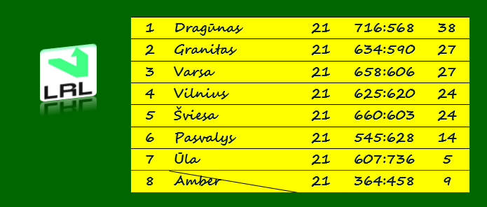 Antrąją ir penktąją vietas užėmusias komandas galutinėje reguliariojo sezono lentelėje skyrė tik trys taškai. „Granitas“ ir „Varsa“ iškovojo po 27 taškus, „Vilnius“ ir „Šviesa“ – po 24 taškus.