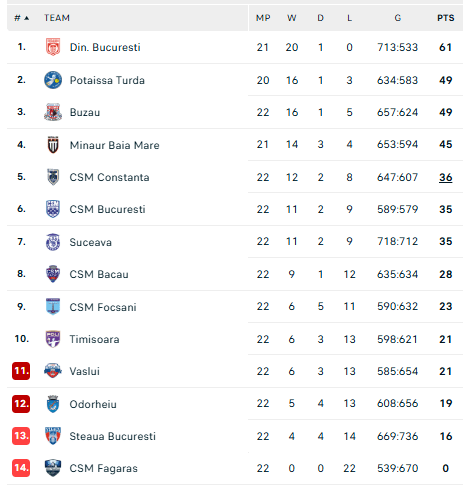Pirmauja: „Dinamo“ – 61, „Potaissa“, „Buzău“ – po 49, „Minaur“ – 45, „Constanța“ -36, … „Bacău“ – 28.