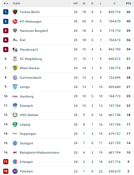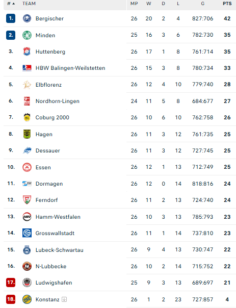 Pirmauja: „Bergische“ – 42, „Minden“, „Hüttenberg“ – po 35, „Balingen“ – 33, „Elbflorenz“ – 28, … „Grosswallstadt“ – 23, „N-Lübbecke“ – 22.