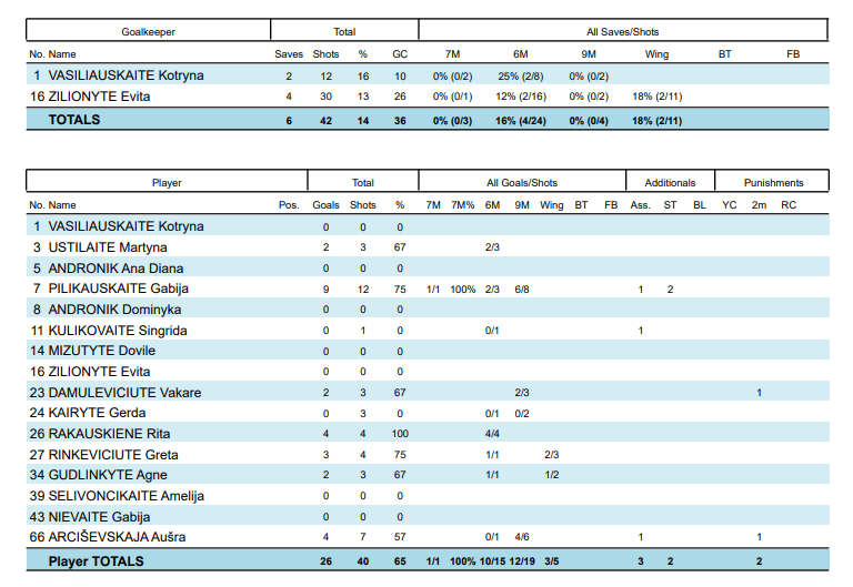 Lietuva: Pilikauskaitė 9, Rakauskienė 4, Arciševskaja 4, Rinkevičiūtė 3, M.Ustilaitė 2, Gudlinkytė 2, Damulevičiūtė 2.