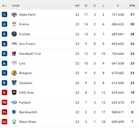 Galutinės lentelės lyderiai: „Alpla“ – 37, „Krems“ – 30, „Füchse“ – 28, „Fivers“ – 26, „Tirol“ – 24, „Linz“ – 23, „Barnbach“ – 23, „Vöslau“ – 23.