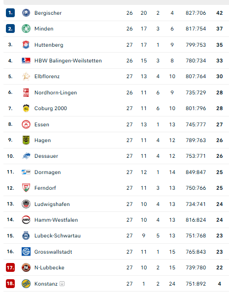 Pirmauja: „Bergische“ – 42, „Minden“ – 37, „Hüttenberg“ – 35, „Balingen“ – 33, „Elbflorenz“ – 30, … „Grosswallstadt“ – 23, „N-Lübbecke“ – 22.