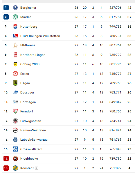 Pirmauja: „Bergische“ – 42, „Minden“ – 37, „Hüttenberg“ – 35, „Balingen“ – 33, „Elbflorenz“ – 30, … „Grosswallstadt“ – 23, „N-Lübbecke“ – 22.