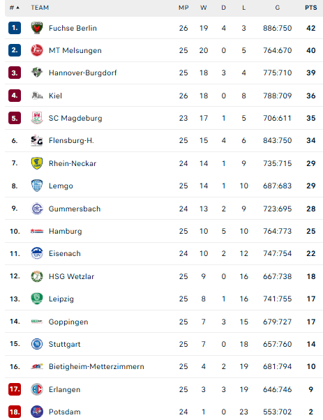 Pirmauja: „Füchse“ – 42, „Melsungen“ – 40, „Hannover“ – 39, „Kiel“ – 36, „Magdeburg“ – 35, „Flensburg“ – 34, … „Stuttgart“ – 14.