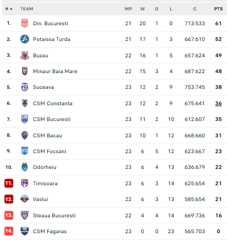 Pirmauja: „Dinamo“ – 61, „Potaissa“ – 52, „Buzău“ – 49, „Minaur“ – 48, … „Bacău“ – 31.
