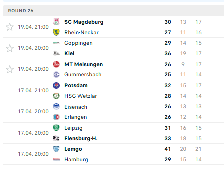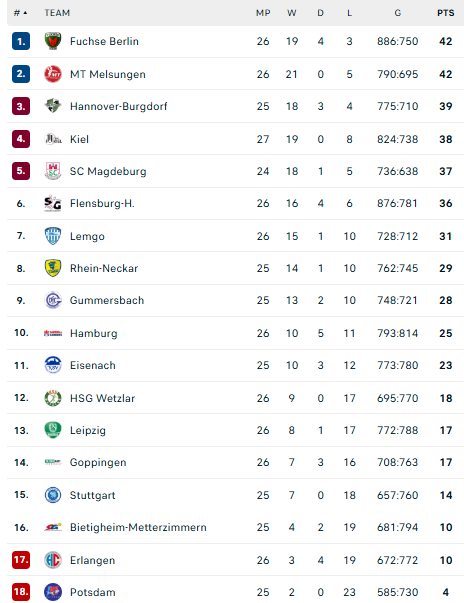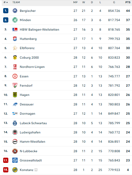 Pirmauja: „Bergische“ – 44, „Minden“ – 37, „Balingen“ – 35, „Hüttenberg“ – 35, „Elbflorenz“ – 30, … „N-Lübbecke“ – 24, „Grosswallstadt“ – 23.