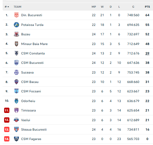 Pirmauja: „Dinamo“ – 64, „Potaissa“ – 55, „Buzău“ – 52, „Minaur“ – 48, „Constanța“ – 39, … „Bacău“ – 31.