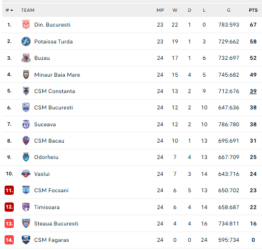 Pirmauja: „Dinamo“ – 67, „Potaissa“ – 58, „Buzău“ – 52, „Minaur“ – 49, „Constanța“ – 39, … „Bacău“ – 31.