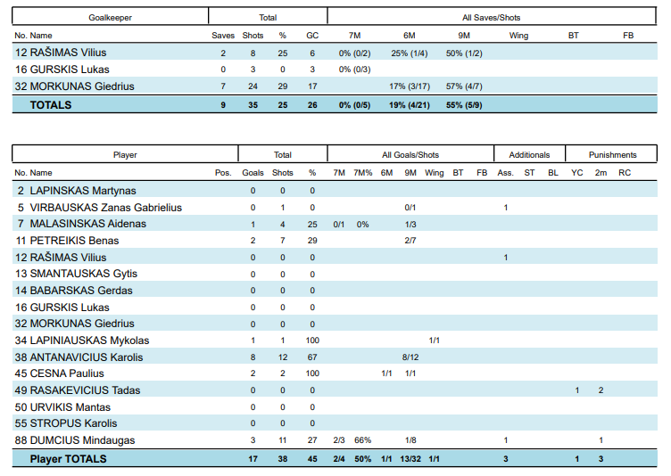 Lietuviai visus keturis įvarčius įmetė tolimais metimais, o makedonai taip pat puikiai rungtynes pradėjusį mūsų vartininką Giedrių Morkūną pirmą sykį nuginklavo tik 9-ąją minutę, kai baudinį įmetė Filipas Kuzmanovskis.