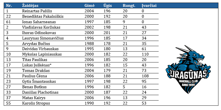 Klaipėdos ekipoje, kaip ir Pasvalio komandoje, žaidžia keli ukrainiečiai. „Dragūno“ aprangą jau ne pirmą sezoną vilki Vladislavas Koržukas, Ihoras Odinokovas ir Daniilas Plachotinas. Prie komandos pritapo ir šio sezono viduryje atvykęs moldavas vartininkas Ionas Saharneanas.