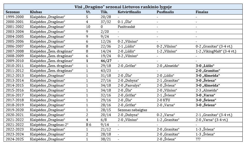Kaip jau minėta, „Dragūnas“ pirmą kartą šalies čempionu tapo 2010 metais. Po to klaipėdiečiai Lietuvos rankinio arenose viešpatavo visą dešimtmetį ir 2019 metais aukso medalius iškovojo devintąjį kartą (pergalių virtinė buvo nutrūkusi tik 2016 m., kai čempione tapo „Varsa“).