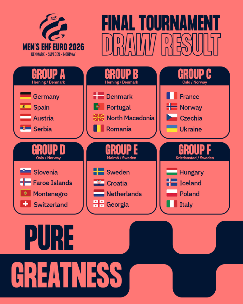 Danijos mieste Herninge, kuriame šiuo metu vyksta pasaulio ledo ritulio pirmenybės, ketvirtadienį buvo ištraukti 2026 metų Europos vyrų rankinio pirmenybių burtai. Per juos 24 komandos buvo suskirstytos į šešias grupes.