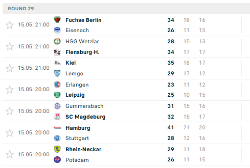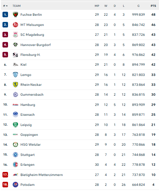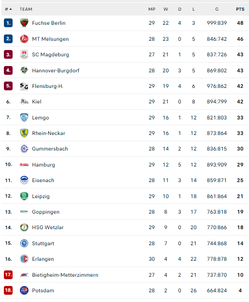 Pirmauja: „Füchse“ – 48, „Melsungen“ – 46, „Magdeburg“ – 43, „Hannover“ – 43, „Flensburg“ – 42, „Kiel“ – 42.