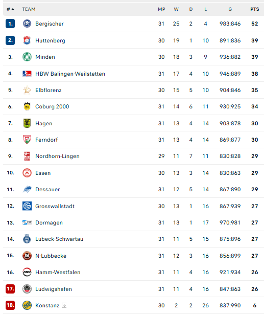 Pirmauja: „Bergische“ – 52, „Hüttenberg“, „Minden“ – po 39, „Balingen“ – 38, „Elbflorenz“ – 35, … „Grosswallstadt“, „N-Lübbecke“ – po 27.