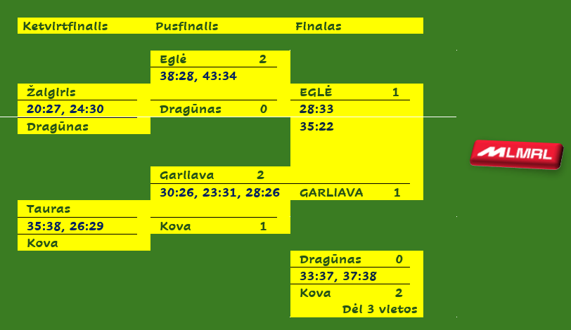 Sekmadienį antrosiose finalo rungtynėse reguliariojo sezono nugalėtoja Vilniaus „Eglė“ išvykoje įtikinamai įveikė čempionės vardą ginančią „Garliavą“ 35:22 (14:12) ir išlygino serijos iki trijų pergalių rezultatą 1:1. Trečiosios finalo rungtynės bus žaidžiamos ketvirtadienį (gegužės 22 d.) Vilniuje.