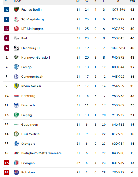 Ketvirtadienį įvyko bundeslygos lyderių dvikova, kurioje didelį žingsnį aukso link žengė Berlyno „Füchse“ rankininkai. Jie sutriuškino iki šio turo tiek pat taškų turėjusią „Melsungen“ komandą ir tapo vienvaldžiais lyderiais.