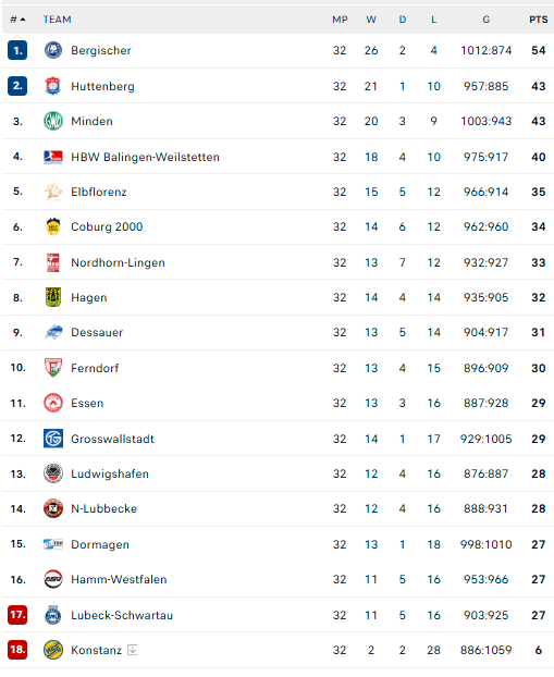 Pirmauja (po 32 turų): „Bergische“ – 54, „Hüttenberg“ – 43, „Minden“ – 43, „Balingen“ – 40, „Elbflorenz“ – 35.