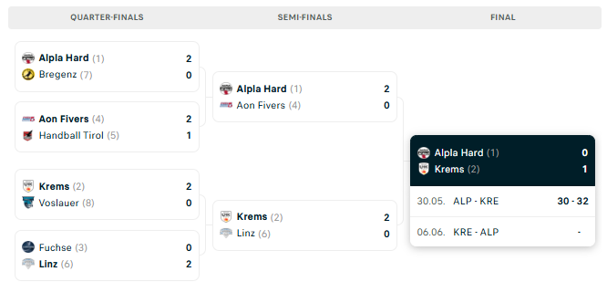 „Alpla“ tikslas susigrąžinti Austrijos čempionės vardą tapo sunkiau pasiekiamas. Hardo komanda penktadienį savo aikštėje pralaimėjo pirmąsias finalo rungtynes ir serijoje iki dviejų pergalių atsilieka 0:1. Antrosios rungtynės bus žaidžiamos kitą penktadienį Kremse.